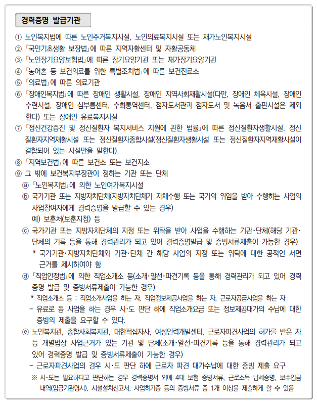 ■ 경력증명발급기관(아래 표 참조) 에서 생활지도원, 유급가정봉사원, 간병인 등으로 근무